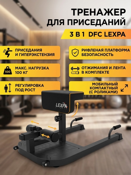 Тренажер для приседаний DFC D282 - ОписаниеСомневаетесь? - Посмотрите рейтинг ТОП-10 по категории «Силовые тренажеры»Тренажер для приседаний LEXPA - это многофункциональный тренажер, который поможет укрепить мышцы ног, ягодиц, спины и пресса. С помощью этого тренажера можно выполнять различные упражнения, такие как приседания, гиперэкстензия и отжимания. Тренажёр выдерживает нагрузку до 100 кг.