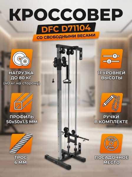 Кроссовер со свободными весами DFC D71104 - ОписаниеКроссовер со свободными весами DFC D71104 - это отличное решение для занятий в домашних условиях. Максимальная нагрузка на конструкцию допустима до 150 кг, толщина троса составляет 6 мм. В комплекте рифлёные ручки для тяги с пятью крючками длиной 42 см для регулировки высоты хвата, их высота регулируется на 11 уровней.