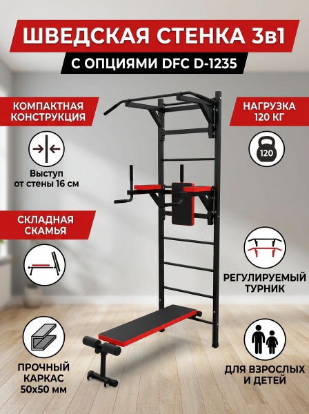 Шведская стенка с опциями DFC D-1235 - ОписаниеШведская стенка DFC D-1235 – это средний уровень серии Lite. Благодаря большому количеству опций, вы сможете выполнять подтягивания двумя хватами, упражнения на брусьях и скамье с валиками. Этот тренажёр станет незаменимым и компактным решением для ежедневных тренировок. Существует множество различных упражнений, выполняемых на стандартной шведской стенке. На данной модели вы сможете выполнять упражнения для укрепления мышц ног, спины и пресса, а также разминочные тренировки.