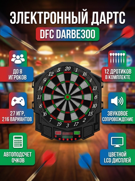 Дартс DFC DARDBE300 - ОписаниеDFC DARBE300 - это усовершенствованная электронная мишень для игры в дартс. Она представляет собой надежную и прочную мишень, которая подарит вам настоящее удовольствие от процесса.