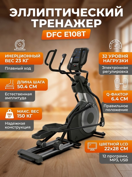 Магнитный эллиптический тренажер DFC E108T - ОписаниеСомневаетесь? - Посмотрите рейтинг ТОП-10 по категории «Домашние эллиптические тренажеры»E108T — эллиптический тренажёр премиум-класса с передним маховиком для домашнего использования. Идеально подходит в качестве кардио-тренажёра для снижения массы тела и повышения выносливости, а также для поддержания мышц в тонусе.