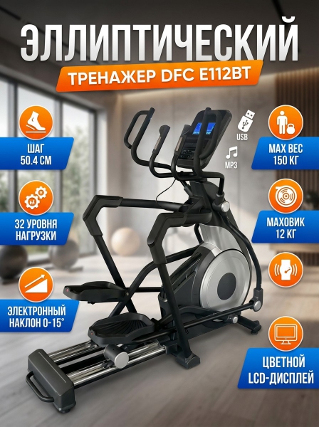 Эллиптический тренажер для дома DFC E112BT - ОписаниеСомневаетесь? - Посмотрите рейтинг ТОП-10 по категории «Домашние эллиптические тренажеры»E112BT — высокопроизводительный и качественный эллиптический тренажёр премиум-сегмента. 12-килограммовый маховик расположен спереди, что удобно для домашних тренировок.