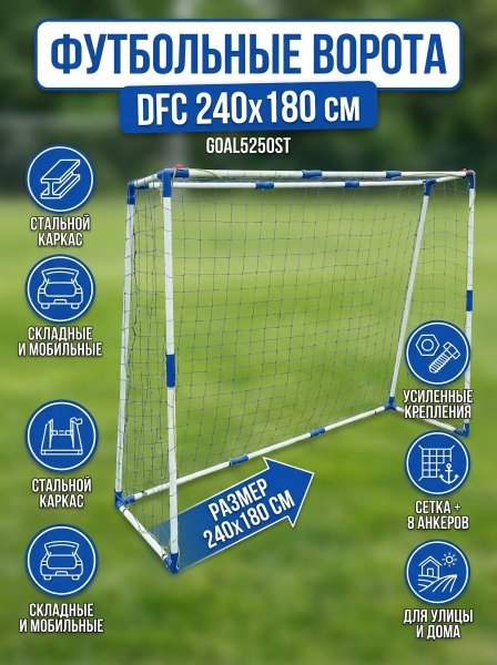 Ворота игровые стальные 8ft DFC GOAL5250ST - ОписаниеСомневаетесь? - Посмотрите рейтинг ТОП-10 по категории «Ворота для футбола»Ворота игровые футбольные 5 футов рекомендованы для игры на улице и в помещении. Складная конструкция поможет лекго брать их с собой.
