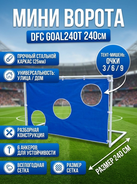 Компания основана в Китае – родине многих организаций, работающих в сфере высоких технологий по производству спортивного оборудования. С 2006 года компания вышла на мировой рынок и получила международный сертификат ISO, подтверждающий безопасность в сфере производства. В ассортименте фирмы вы найдете тренажеры, спортивные аксессуары, массажеры и лимфодренажные аппараты, аспираторы, приборы массажного давления и многое другое. Цель компании – сделать мир лучше и красивее с помощью собственной продукции! Страна бренда: Россия Премиальность бренда:Футбольные ворота с тентом DFC GOAL240T - Характеристики