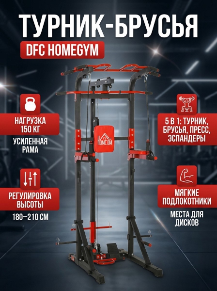 Турник-брусья, тяга сверху DFC HOMEGYM HOMCOM D270 - ОписаниеСомневаетесь? - Посмотрите рейтинг ТОП-10 по категории «Турники»Прочная и безопасная многофункциональная силовая станция с турником. Она изготовлена из усиленной стальной рамы, имеет прочную конструкцию и усовершенствованную конструкцию.