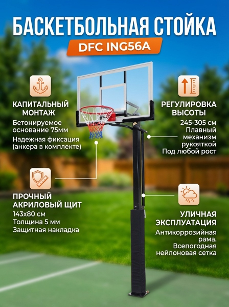 Баскетбольная стационарная стойка DFC ING56A - ДоставкаДоставка по Москве: бесплатно, 1-2 дняДоставка по Санкт-Петербургу: бесплатно, 2-3 дня Доставка по России: стоимость уточняйте у оператора. Баскетбольная стационарная стойка DFC ING56A - Отзывы4.7