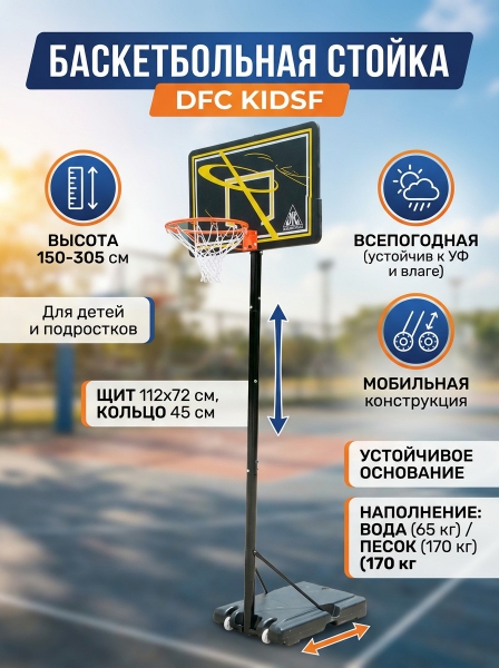 Мобильная баскетбольная стойка DFC KIDSF - ОписаниеДетская мобильная стойка для игры в баскетбол (стритбол). Для установки в помещении и на улице. Для устойчивости в основание необходимо залить воду или засыпать песок. Телескопическая регулировка высоты от 150 до 305 см (по кольцу). Баскетбольное кольцо Ø45 см. Всепогодная нейлоновая сетка в комплекте.