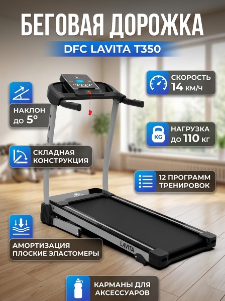 Беговая дорожка для дома DFC Lavita T350 - ОписаниеСомневаетесь? - Посмотрите рейтинг ТОП-10 по категории «Беговые дорожки»Электрическая беговая дорожка LAVITA для занятий дома. Тренажер начального уровня с мотором мощностью 1.75 л.с.