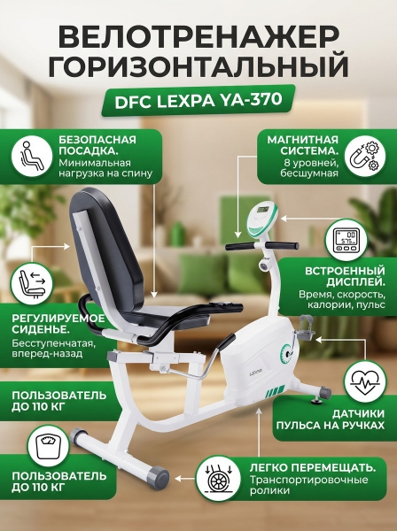 Велотренажер DFC LEXPA YA-370 - ОписаниеСомневаетесь? - Посмотрите рейтинг ТОП-10 по категории «Домашние велотренажеры»Горизонтальный велотренажер LEXPA YA-370 создан для комфортных и эффективных домашних тренировок, сочетая в себе передовые технологии и эргономичный дизайн. Мягкое вращение педалей практически не создает шума, что особенно важно для людей с чувствительными суставами. Амортизирующие педали снижают нагрузку и предотвращают неприятные ощущения, позволяя заниматься спортом в любое время суток, не беспокоя домочадцев.