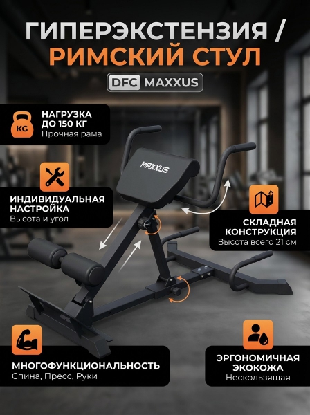 Гиперэкстензия / римский стул DFC MAXXUS GSMX-600417-00019-0001 - ОписаниеСомневаетесь? - Посмотрите рейтинг ТОП-10 по категории «Скамьи для гиперэкстензии»Гиперэкстензия / римский стул DFC MAXXUS GSMX-600417 — универсальное решение для домашних тренировок. Это многофункциональное оборудование позволяет прорабатывать мышцы кора, спины, ягодиц, бедер, брюшной полости и рук. Подходит как для новичков, так и для опытных пользователей, стремящихся укрепить мышечный корсет и повысить общую физическую форму.