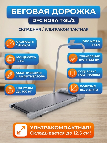 Беговая дорожка DFC NORA T-SL/2 - ОписаниеСомневаетесь? - Посмотрите рейтинг ТОП-10 по категории «Домашние беговые дорожки»Электрическая беговая дорожка DFC NORA – это складная модель, которая идеально подходит для домашнего использования благодаря компактным размерам в сложенном виде (122 x 50 x 12 см) и транспортировочным роликам.