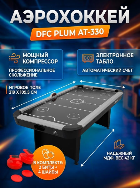 Игровой стол - аэрохоккей DFC PLUM AT-330 - ОписаниеСомневаетесь? - Посмотрите рейтинг ТОП-10 по категории «Аэрохоккей»Игровой стол - аэрохоккей DFC AT-330 "PLUM" - это отличная развлекательная площадка для домашнего отдыха. Веселая игра на аэрохоккее прекрасно сближает друзей и семью, дарит увлекательное времяпрепровождение и отличный способ развлечения.