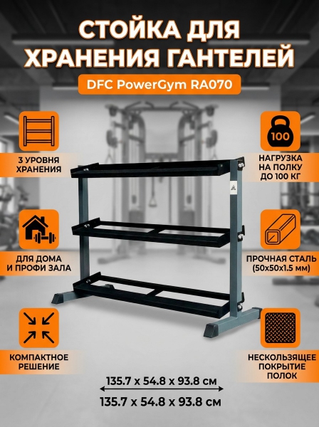 Стойка для хранения гантелей DFC PowerGym RA070 - ОписаниеСтойка для хранения профессиональных гантелей DFC из серии POWERGYM RA070 чёрного цвета с серым корпусом для домашнего использования.