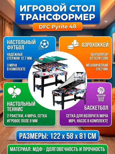 Игровой стол - трансформер DFC Pyrite 48" AT-240 - ОписаниеИгровой стол – трансформер DFC Pyrite 48” 4 в 1 для досуга детей и взрослых. Вентилятор работает от сети 220 В. Диаметр стержней для настольного футбола 12,7 мм.