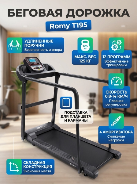 Беговая дорожка DFC Romy T195 - ОписаниеСомневаетесь? - Посмотрите рейтинг ТОП-10 по категории «Домашние беговые дорожки»Электрическая беговая дорожка DFC Romy — идеальный выбор для домашнего использования, обеспечивающий комфортные условия для тренировок в спортивных и реабилитационных целях. Модель отличается присутствием в комплектации специальных удлинённых поручней для реабилитационных занятий.
