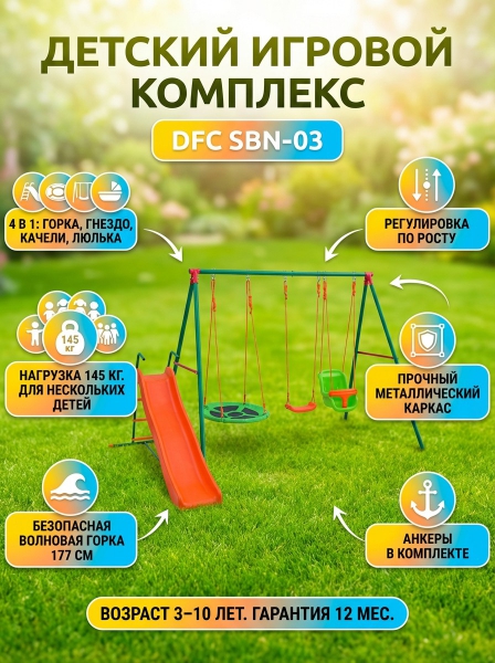 Детский комплекс с горкой DFC SBN-03 - ОписаниеДетский игровой комплекс для установки на улице, в парке или на даче. Комплекс включает в себя: веревочные качели, качели - гнездо и качели для малышей, и горку. Регулируемые по высоте веревки для качелей. Спускной желоб и сидение качелей изготовлены из пластика. Комплекс подходит для детей в возрасте от 3 до 10 лет. На качели для малышей допускаются детишки в возрасте от 18 до 36 месяцев. Сборная конструкция детских качелей упрощает процесс сборки игрового комплекса.
