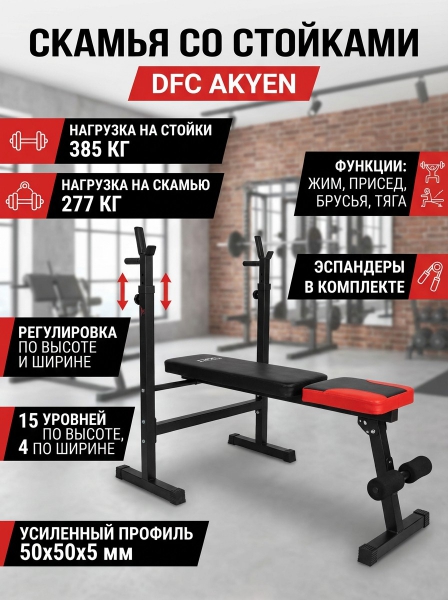 Скамья прямая со стойками под штангу DFC AKYEN - БрендDFC – бренд, поставляющий на рынок специализированные приборы и оборудование для красоты и здоровья.
