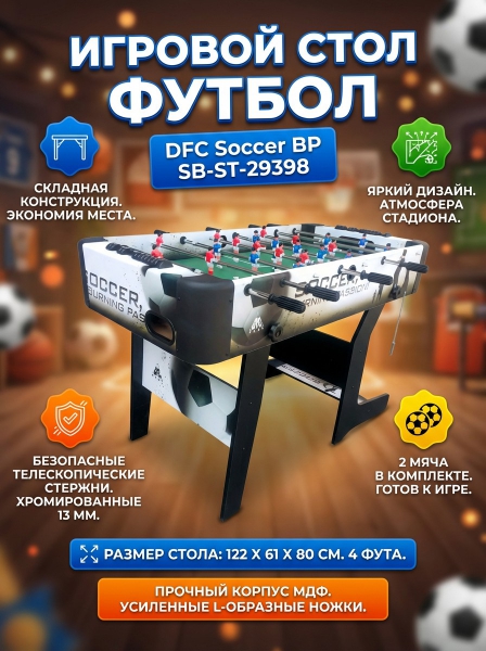 Игровой стол для футбола DFC Soccer BP - ОписаниеСомневаетесь? - Посмотрите рейтинг ТОП-10 по категории «Настольный футбол (кикер)»Игровой стол-футбол DFC Soccer BP SB-ST-29398 для домашнего использования. Складная модель. Боковые стороны из МДФ ламинированным ПВХ высотой 19,5 см и толщиной 12 мм. Стороны со стороны игроков высотой 19,5 см и толщиной 9 мм. L-образная ножка из МДФ толщиной 15 мм, средняя – 12 мм.