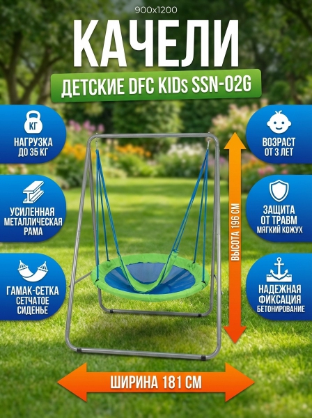 Качели одноместные DFC SSN-02G - ОписаниеМногофункциональные качели-гамак SSN-02G серии DFC Kids — идеальный вариант для дачного участка. Они позволят ребенку не только весело провести время, но и комфортно отдохнуть на свежем воздухе.