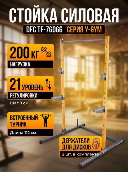 Стойка силовая DFC TF-76066 - ОписаниеСомневаетесь? - Посмотрите рейтинг ТОП-10 по категории «Силовые стойки»Силовая рама, стойка для штанги с подстраховкой DFC Y-GYM – многофункциональный тренажёр для домашних тренировок. Серия Y-GYM – это тренажеры в современном дизайне, где динамичный желтый цвет гармонично сочетается с элегантным черным. Продуманная геометрия и контрастное цветовое решение позволят тренажеру гармонично вписаться в любую комнату и стать ярким акцентом вашего интерьера. Это идеальное решение для тех, кто ценит функциональность и эстетику в каждой детали своего дома.