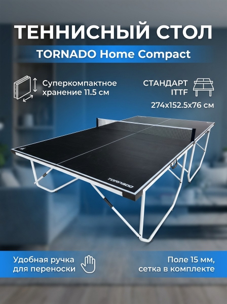Теннисный стол DFC TORNADO Home Compact - ОписаниеСомневаетесь? - Посмотрите рейтинг ТОП-10 по категории «Для закрытых помещений»Представляем новый теннисный стол от бренда DFC - модель TORNADO Home Compact. Высококачественный теннисный стол предназначен для использования в помещении. Удобная система складывания отдельно каждой из сторон стола с фиксацией в собранном положении и ручкой для переноски. Сетка для игры поставляется в комплекте. Необходима предварительная установка сетки перед игрой, и демонтаж перед складыванием. Возможность одиночной игры не предусмотрена.
