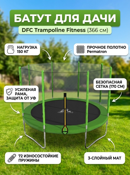 Батут для дачи DFC Trampoline Fitness 12FT-TR-LG - ОписаниеОбновленный батут популярной серии Trampoline Fitness. Модель с внешней защитной сеткой и яркой зеленой расцветкой. Надежность конструкции обеспечивается прочной рамой с оцинкованным покрытием, нанесенным методом холодной гальванизации. Рама изготовлена из круглой трубы.