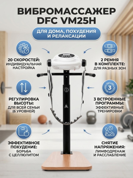 Компания основана в Китае – родине многих организаций, работающих в сфере высоких технологий по производству спортивного оборудования. С 2006 года компания вышла на мировой рынок и получила международный сертификат ISO, подтверждающий безопасность в сфере производства. В ассортименте фирмы вы найдете тренажеры, спортивные аксессуары, массажеры и лимфодренажные аппараты, аспираторы, приборы массажного давления и многое другое. Цель компании – сделать мир лучше и красивее с помощью собственной продукции! Страна бренда: Россия Премиальность бренда:Вибромассажер ленточный DFC VM25H - Характеристики