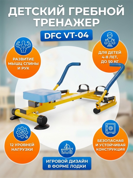 Гребной детский тренажер DFC VT-04 - ОписаниеДетский гребной тренажер DFC VT-04 - это отличный способ для детей укрепить руки и спину во время увлекательной игры. Яркий и необычный внешний вид детского гребного тренажера привлекает внимание юных спортсменов, а детали тренажера напоминают лодку, стимулируя воображение детей и побуждая их к активной деятельности. Неважно, какую игру вы придумаете - плавание на острове в море, погоню за карпом в океане или сплав по горной реке - результат будет один: они получат удовольствие от игры с этим тренажером!