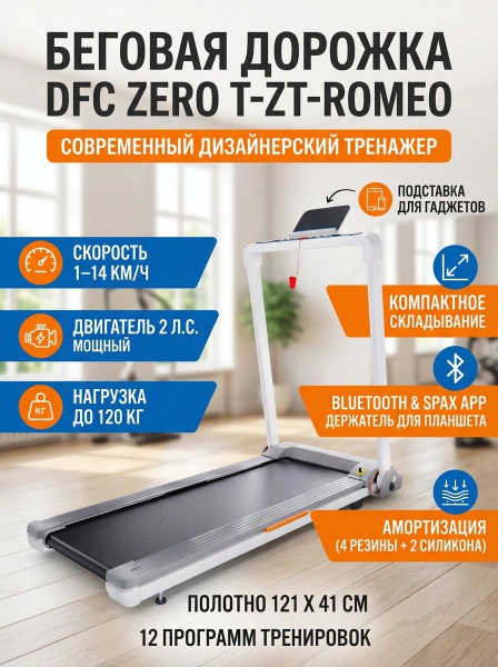 Беговая дорожка DFC ZERO T-ZT-ROMEO - ОписаниеСомневаетесь? - Посмотрите рейтинг ТОП-10 по категории «Домашние беговые дорожки»Беговая дорожка DFC ZERO — отличный выбор для домашних тренировок. Эта модель поддерживает приложение SPAX и подходит для пользователей ростом от 140 см.