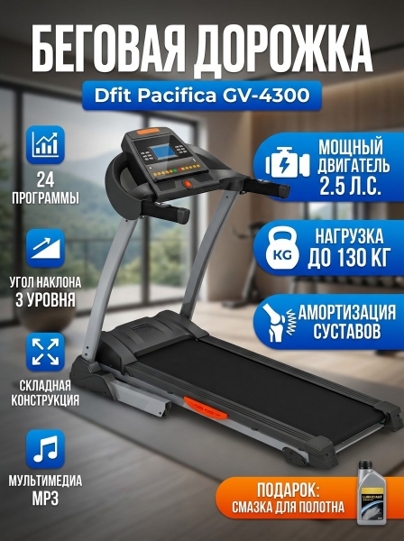 Домашняя беговая дорожка Dfit Pacifica GV-4300 - ОписаниеСомневаетесь? - Посмотрите рейтинг ТОП-10 по категории «Домашние беговые дорожки»Беговая дорожка Pacifica GV-4300 - прекрасный выбор для комфортных домашних занятий.