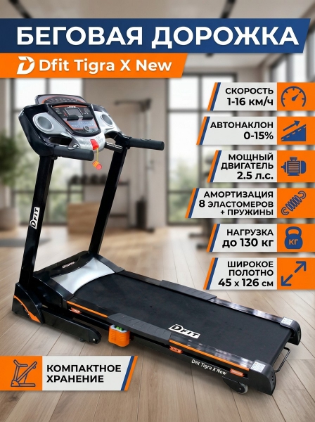 Домашняя беговая дорожка Dfit Tigra X New - ОписаниеСомневаетесь? - Посмотрите рейтинг ТОП-10 по категории «Домашние беговые дорожки»Tigra X New - идеальная беговая дорожка для домашнего использования. Надежная и компактная, она сочетает в себе все основные функции, необходимые для успешной тренировки.