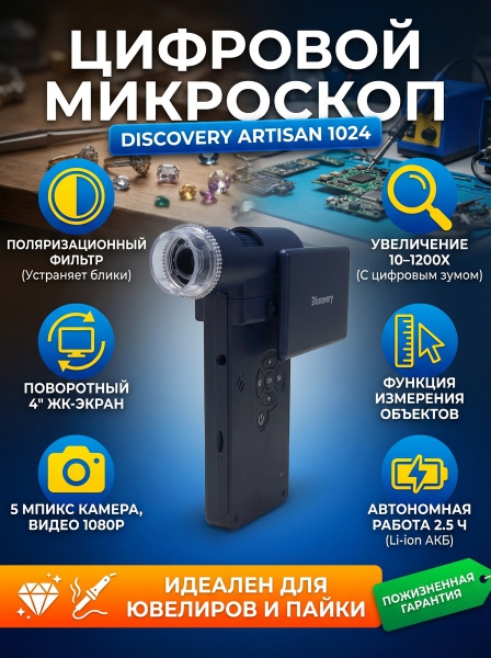 Микроскоп цифровой Discovery Artisan 1024 - ОписаниеМикроскоп Discovery Artisan 1024 – это удобный цифровой инструмент для работы нумизмата, геолога, сотрудника ремонтной мастерской, ювелира, часового мастера и многих других специалистов. Он дает оптическое (10–300х) и цифровое (10–1200х) увеличение, имеет подсветку и поляризационный фильтр, идеально подходит для работы с металлами, минералами, электросхемами, непрозрачными биологическими образцами. Позволяет делать фото, записывать видео и измерять объекты. Прибор может работать может как от сети, так и от аккумулятора, что делает его отличным мобильным вариантом для выездной работы.