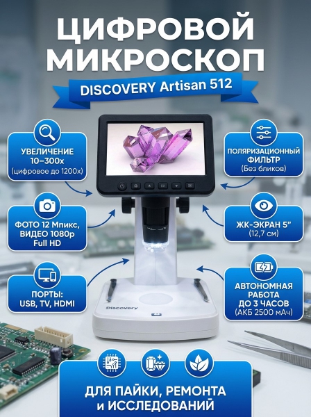 Микроскоп цифровой Discovery Artisan 512 - ОписаниеDiscovery Artisan 512 – это цифровой микроскоп с ЖК-экраном и 5-мегапиксельной камерой. Он позволяет не только визуально изучать образцы, но также делать фотографии, записывать видео, проводить измерения объектов и обработку кадров. Его возможности помогут в работе с металлами, ювелирными изделиями, электронными платами, небольшими деталями и механизмами, минералами, биологическими образцами и многими другими непрозрачными объектами.