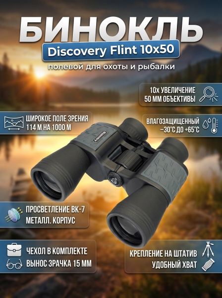 Бинокль армейский Discovery Flint 10x50 - ОписаниеБинокль – это Porro-модель с полностью и многократно просветленной оптикой из стекла BK-7. Бинокль отлично подходит как для прицельных, так и для обзорных наблюдений, так как гармонично сочетает в себе широкое поле зрения и 10-кратное увеличение. Это хороший выбор для охоты, наблюдений за птицами, рыбалки или походов.