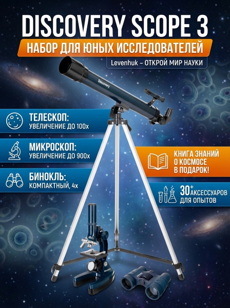 Набор телескоп+микроскоп+бинокль. Discovery Scope 3 с книгой - ДоставкаДоставка по Москве: бесплатно, 1-2 дняДоставка по Санкт-Петербургу: 395 ₽, 2-3 дня Доставка по России: стоимость уточняйте у оператора. Набор телескоп+микроскоп+бинокль. Discovery Scope 3 с книгой - Отзывы0.0
