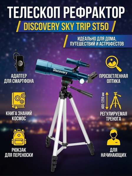 Телескоп рефракторный Discovery Sky Trip ST50 с книгой - ОписаниеТелескоп Discovery Sky Trip ST50 – компактный рефрактор для первого знакомства со звездным небом. Он приблизит Луну и планеты, а в дневное время даст возможность рассмотреть отдаленные наземные объекты. В комплекте с телескопом поставляются множество оптических аксессуаров, иллюстрированная книга «Космос. Непустая пустота» и адаптер для смартфона. Начинающий астроном сможет перейти от теории к практике и даже запечатлеть результаты своих наблюдений на фото.