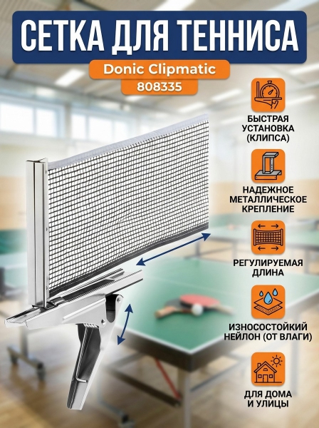 Сетка для настольного тенниса Donic Clipmatic - ОписаниеСетка с креплением для настольного тенниса. Подходит для игры на открытом воздухе и в помещении.