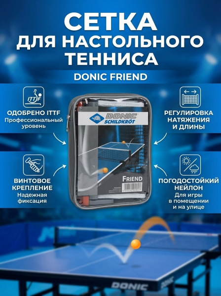 Сетка для настольного тенниса Donic Friend - БрендНемецкий бренд Donic представляет широкий ассортимент спортивного инвентаря, одежды и аксессуаров для настольного тенниса.