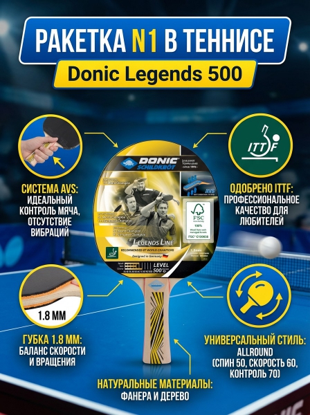 Ракетка для настольного тенниса Donic Legends 500 - БрендНемецкий бренд Donic представляет широкий ассортимент спортивного инвентаря, одежды и аксессуаров для настольного тенниса.