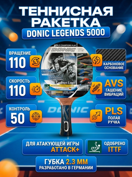 Ракетка теннисная Donic Legends 5000 - ОписаниеРакетка DONIC "LEGENDS 5000" рассчитана на тип игры Атака+. Для покрытия используется накладка Liga, а толщина губки 2,3 мм. Ракетка одобрена Международной федерацией настольного тенниса ITTF.
