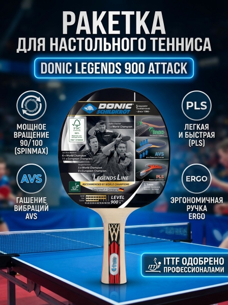 Ракетка для настольного тенниса Donic Legends 900 - БрендНемецкий бренд Donic представляет широкий ассортимент спортивного инвентаря, одежды и аксессуаров для настольного тенниса.