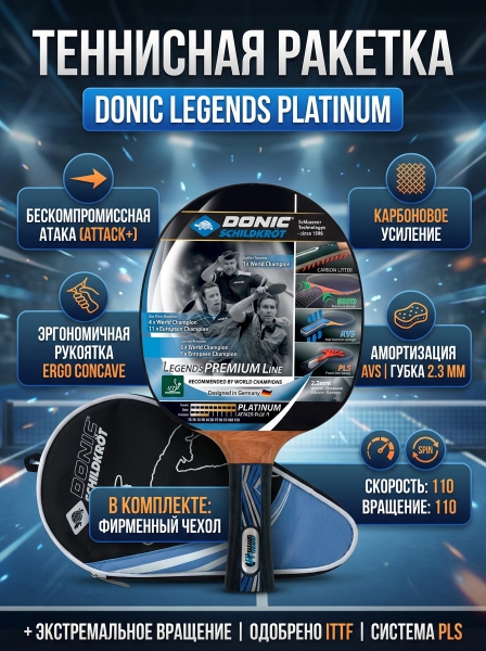 Теннисная ракетка Donic Legends Рlatinum - БрендНемецкий бренд Donic представляет широкий ассортимент спортивного инвентаря, одежды и аксессуаров для настольного тенниса.