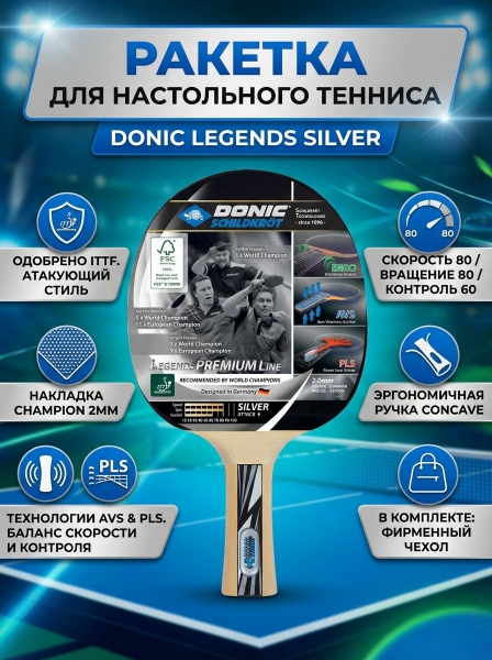 Теннисная ракетка Donic Legends Silver - БрендНемецкий бренд Donic представляет широкий ассортимент спортивного инвентаря, одежды и аксессуаров для настольного тенниса.