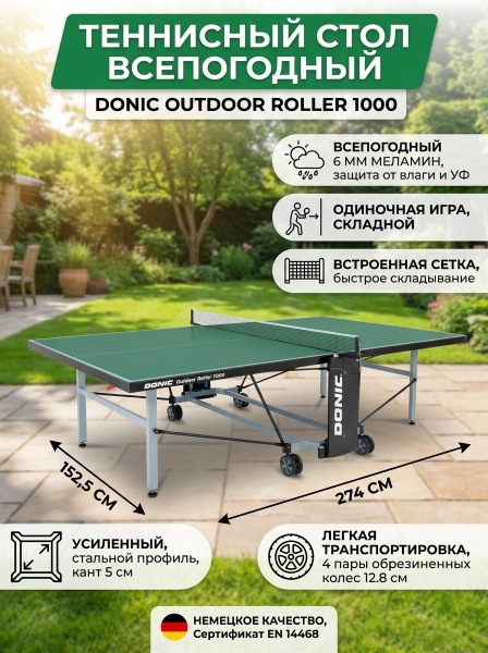 Теннисный стол Donic Outdoor Roller 1000 green - ДоставкаДоставка по Москве: бесплатно, 1-2 дняДоставка по Санкт-Петербургу: бесплатно, 2-3 дня Доставка по России: стоимость уточняйте у оператора. Теннисный стол Donic Outdoor Roller 1000 green - Отзывы5.0