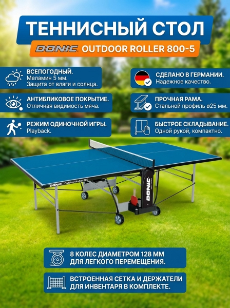 Теннисный стол Donic Outdoor Roller 800-5 синий - БрендНемецкий бренд Donic представляет широкий ассортимент спортивного инвентаря, одежды и аксессуаров для настольного тенниса.