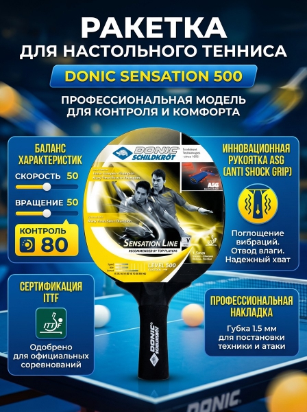 Ракетка Donic Sensation 500 - ОписаниеАнтискользящая ручка (anti-slip) в серии ракеток Sensation Line это особая концепция c привлекательной особенностью ASG (Anti Shock Grip). Это легкий и прочный винил защищает руку от пота и вибраций, предназначена для надежного хвата и игры с большим комфортом и лучшей играбельностью.
