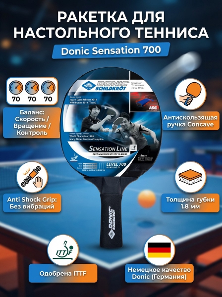 Ракетка Donic Sensation 700 - ДоставкаДоставка по Москве: бесплатно, 1-2 дняДоставка по Санкт-Петербургу: 395 ₽, 2-3 дня Доставка по России: стоимость уточняйте у оператора. Ракетка Donic Sensation 700 - Отзывы5.0