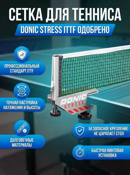 Сетка с креплением Donic Stress - БрендНемецкий бренд Donic представляет широкий ассортимент спортивного инвентаря, одежды и аксессуаров для настольного тенниса.