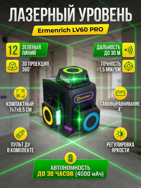 Лазерный уровень Ermenrich LV60 PRO, фиолетовый - ОписаниеОсновное преимущество портативного лазерного уровеня Ermenrich LV60 PRO – невероятно компактный размер и маленький вес. Он не обременяет в дороге, легко транспортируется в рабочей сумке, может уместиться даже на ладони. Габариты прибора: 7х7х9,5 см. Вес: 340 грамм. Лазерный уровень работает в трех проекциях, формируя 12 линий зеленого цвета. Это отличный инструмент для строителя, монтажника, мастера по гипсокартонным и другим отделочным работам.