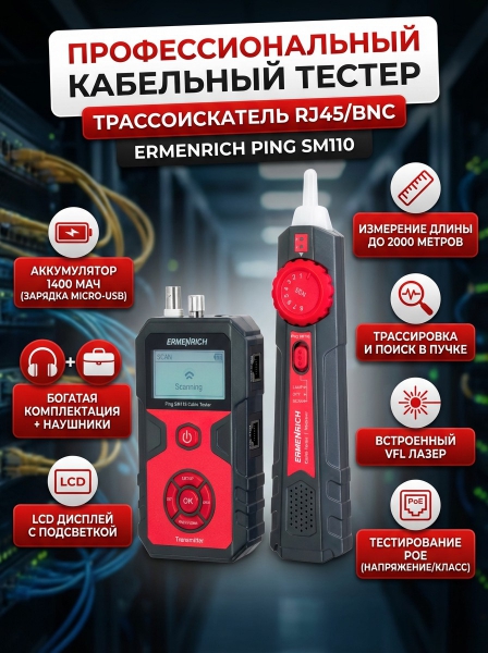 Модель Ermenrich Ping SM110 подходит для диагностики кабелей длиной до 2000 м. Во внутреннюю память можно сохранять до 5 результатов тестирования и измерения. Комплект тестера включает в себя передатчик с дисплеем и кнопками, приемник с регулировкой чувствительности и 4 дистанционных модуля. Кроме того, тестер укомплектован наушниками для работы при сильном шуме, гнездо для подключения наушников находится на приемнике. Приемник и передатчик работают от литиевых аккумуляторов емкостью 1400 мАч. В комплект входит кабель microUSB для зарядки батарей.